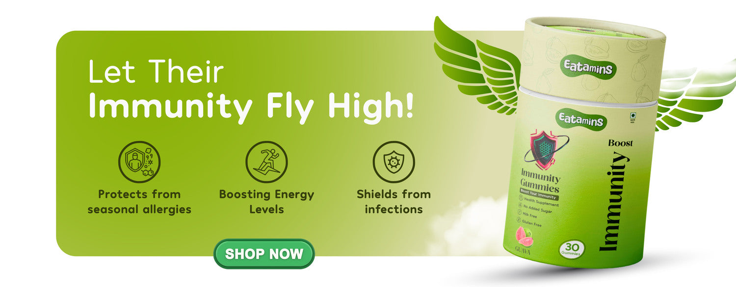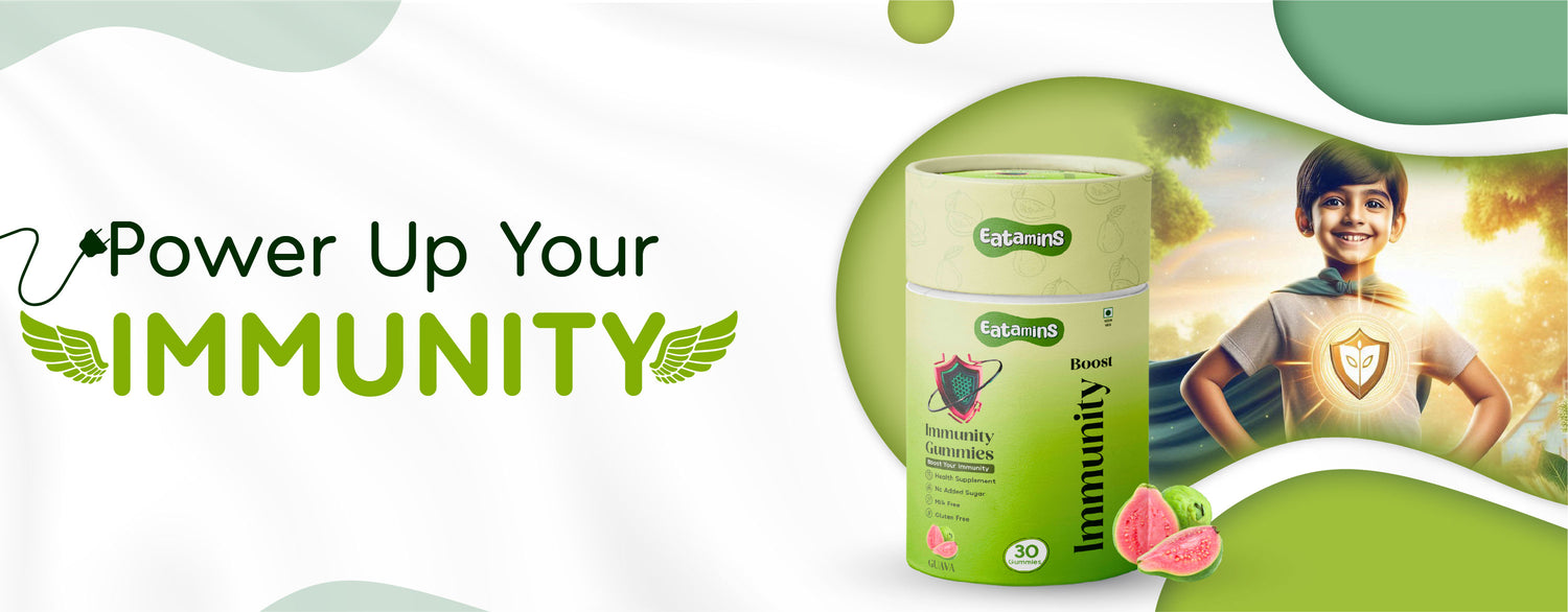 Eatamins Immunity Gummies. It helps to boost immunity naturally. It is made with Vitamins -A, B1, B2, B6, C, B12, and E, Zinc, Copper, and Biotin, which helps boost energy levels, shield against infections, protect from seasonal allergies, and also promote healthy growth in kids.
